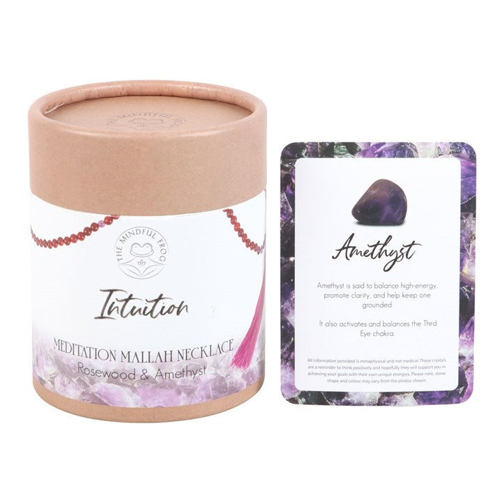 Crafted from rich, warm rosewood beads and interlaced with delicate Amethyst stones, this elegant necklace showcases 108 beads — a traditional number in Mallah necklaces symbolizing spiritual journey and mindfulness — and is finished with a decorative tassel. The Amethyst, revered for its ability to enhance intuition and mental clarity, is associated with the third eye chakra. It is believed to deepen understanding, promote calmness, and foster spiritual growth, thereby heightening the wearer's intuitive abilities and inner wisdom. A Mallah, or Mala, necklace is a string of beads traditionally used in meditation and prayer in various spiritual practices including Buddhism and Hinduism. Each bead represents a repetition of a mantra or prayer, aiding in focus and spiritual contemplation. To use simply hold the necklace in one hand and move from bead to bead whilst focusing on mindful breathing and repeating an intention. The necklace can be worn throughout the day as a reminder of these intentions. Each Mallah Necklace is presented in a beautifully designed box, accompanied by a corresponding information card, making it an ideal and thoughtful gift for a loved one to deepen their spiritual practice and enhance their intuitive powers.